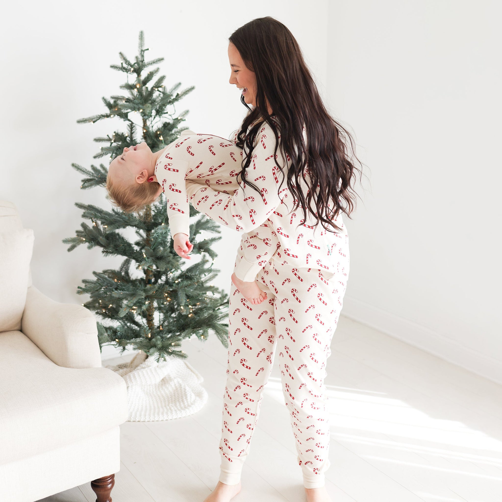 Jogger style pajama pants feature a tapered leg fit with an elastic waistband + cotton drawstring, and cotton rib ankle cuffs.